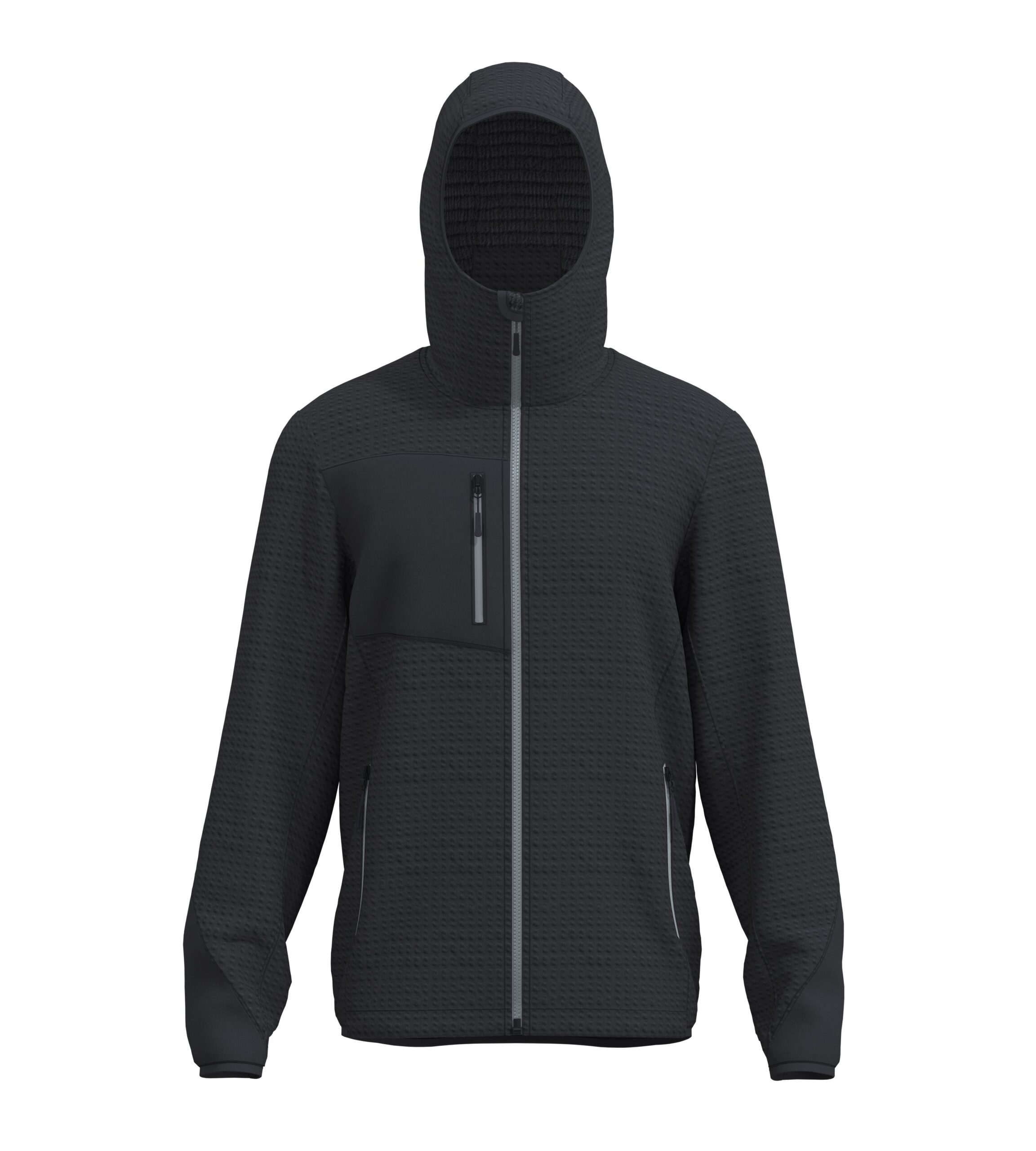 – Una tasca sul petto con zip termosaldata