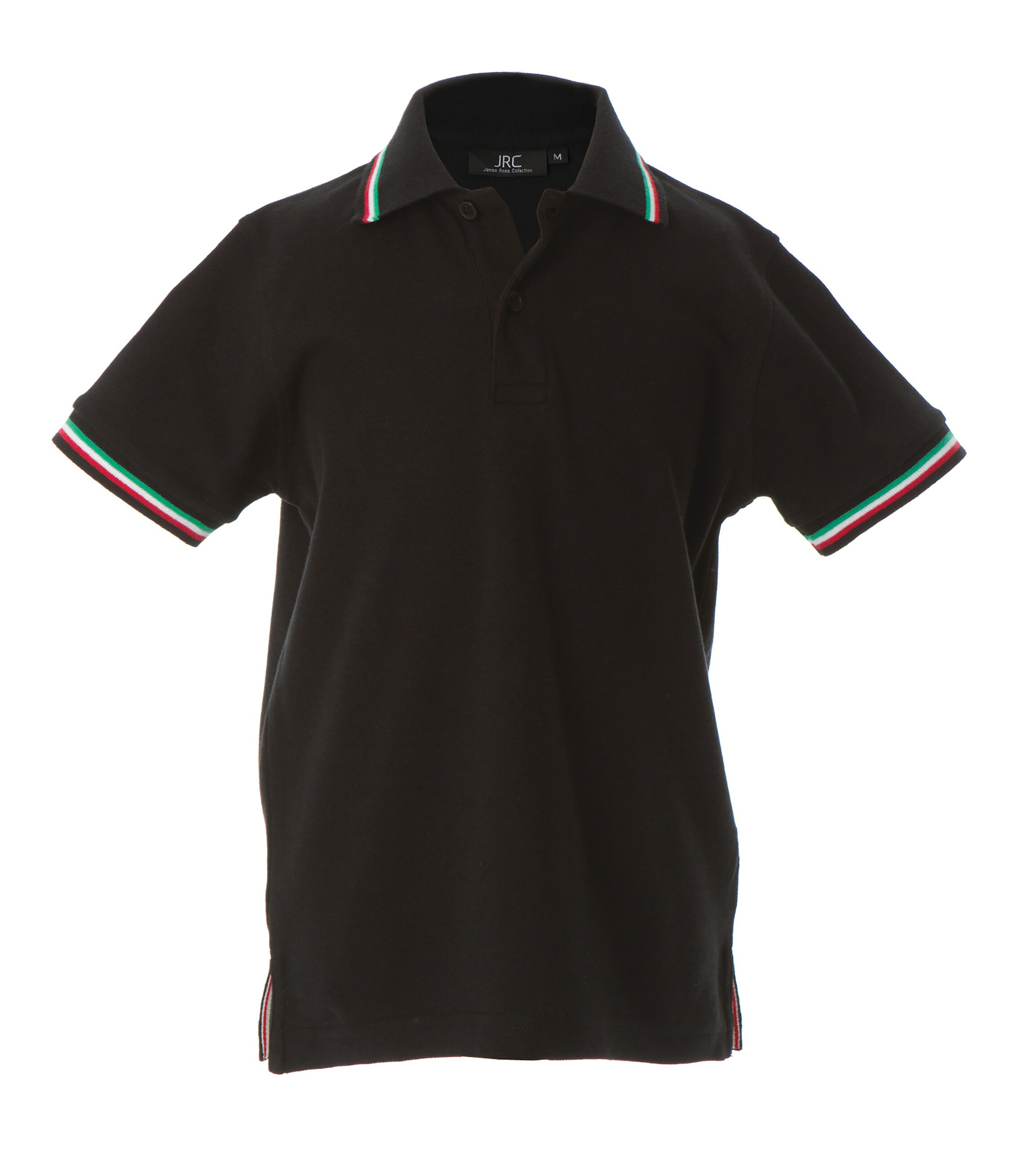 – Doppio piping tricolore su colletto e fondo manica in rib