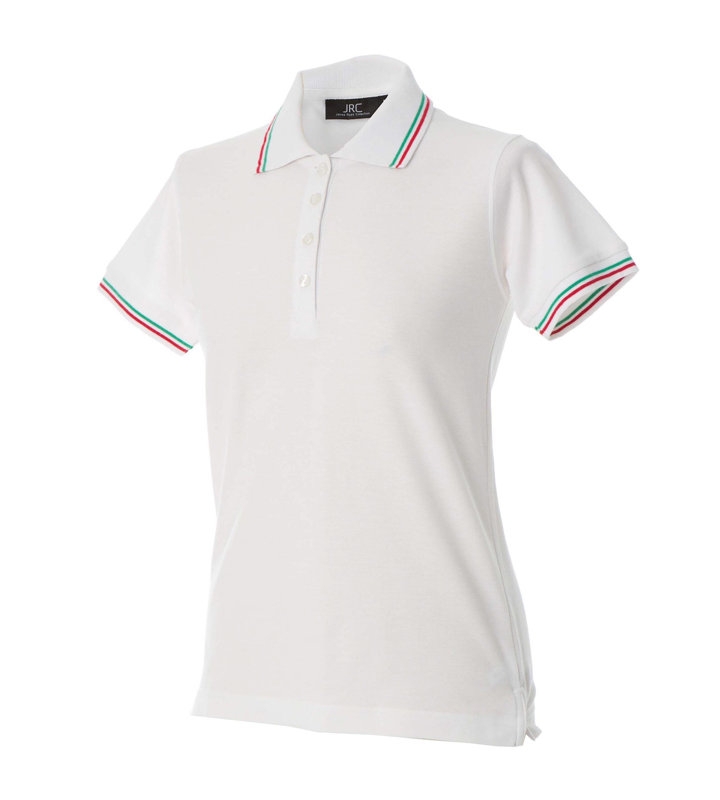 – Doppio piping tricolore su colletto e fondo manica in rib