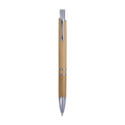 Penna a scatto in bambù e metallo. Particolari bruniti e gommino touch screen