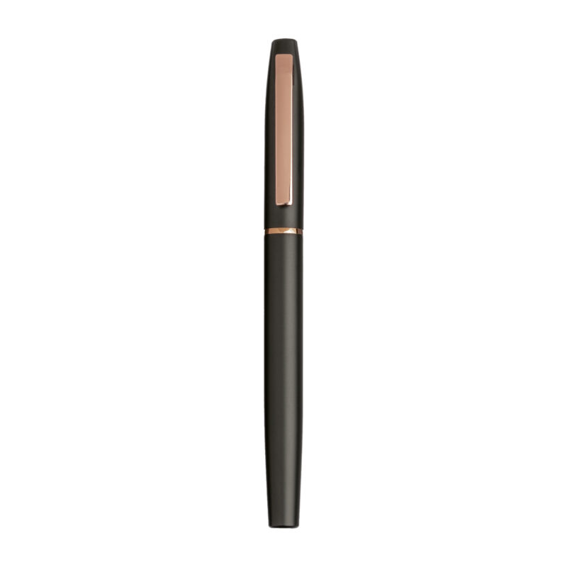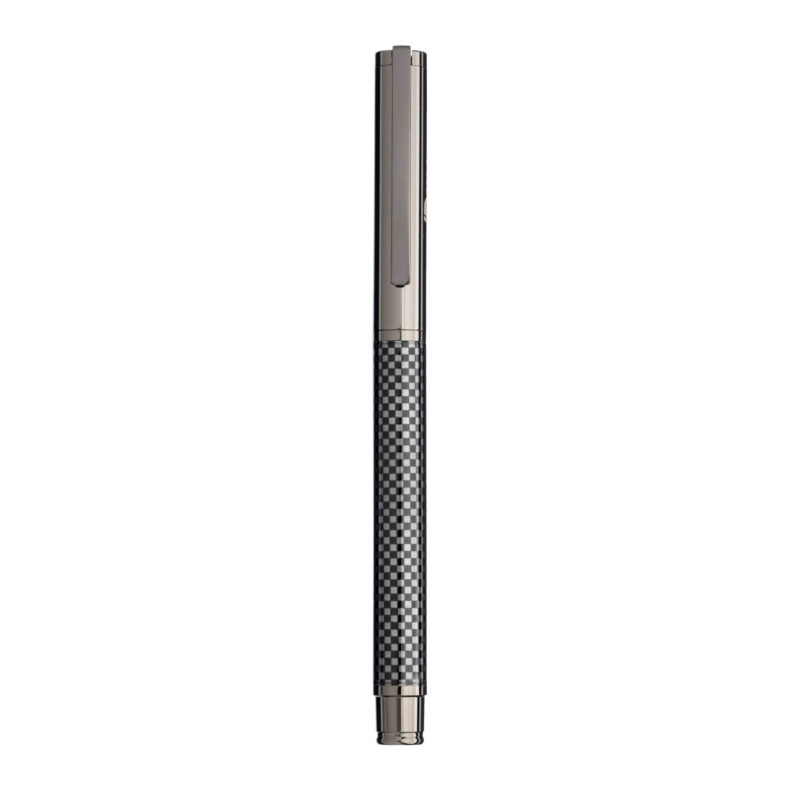 Penna a scatto in metallo brunito. Finiture in fibra di vetro, con scatola in cartoncino