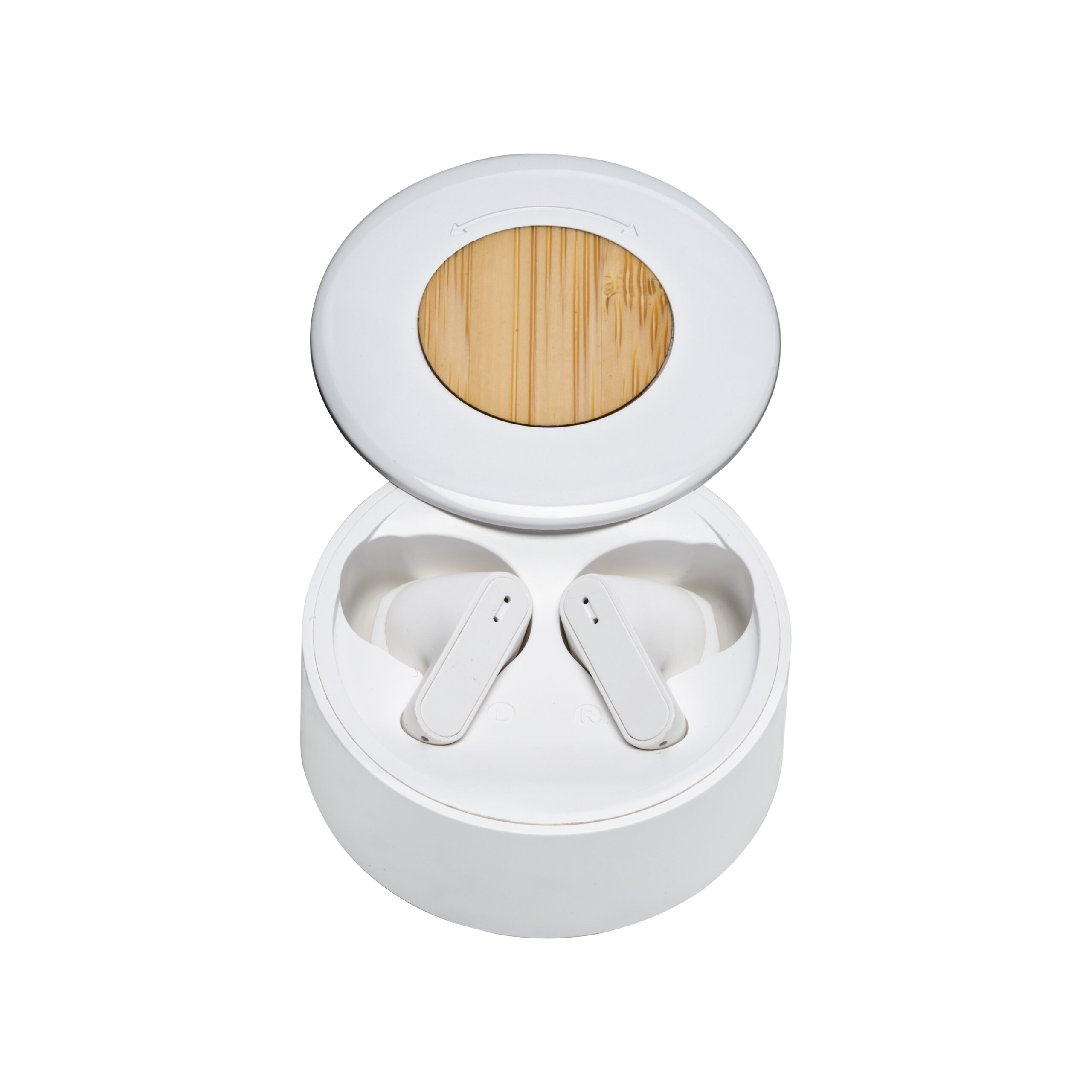 Auricolari in RABS (ABS riciclato) con inserto in bambù. Connessione Bluetooth® 5.3, batteria al litio integrata da 30 mAh. Base con capacità di 250 mAh e indicatore di stato di carica a LED, cavo di ricarica Type-C incluso