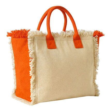 Borsa in juta con manici lunghi in corda e inserti colorati. Con soffietto
