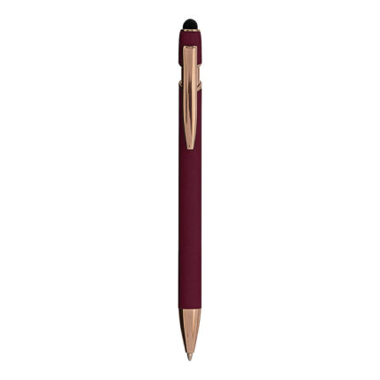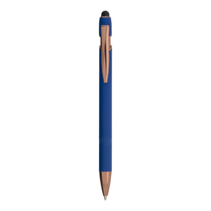 Penna a scatto in alluminio gommato con gommino per touch screen, clip in metallo e finiture color golden rose. In caso di personalizzazione il logo laser sarà in color golden rose