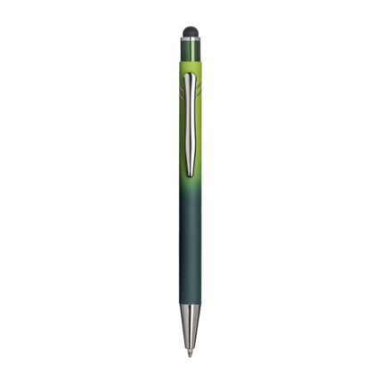 Penna a scatto in alluminio gommato. Fusto sfumato, clip e particolari metallizzati