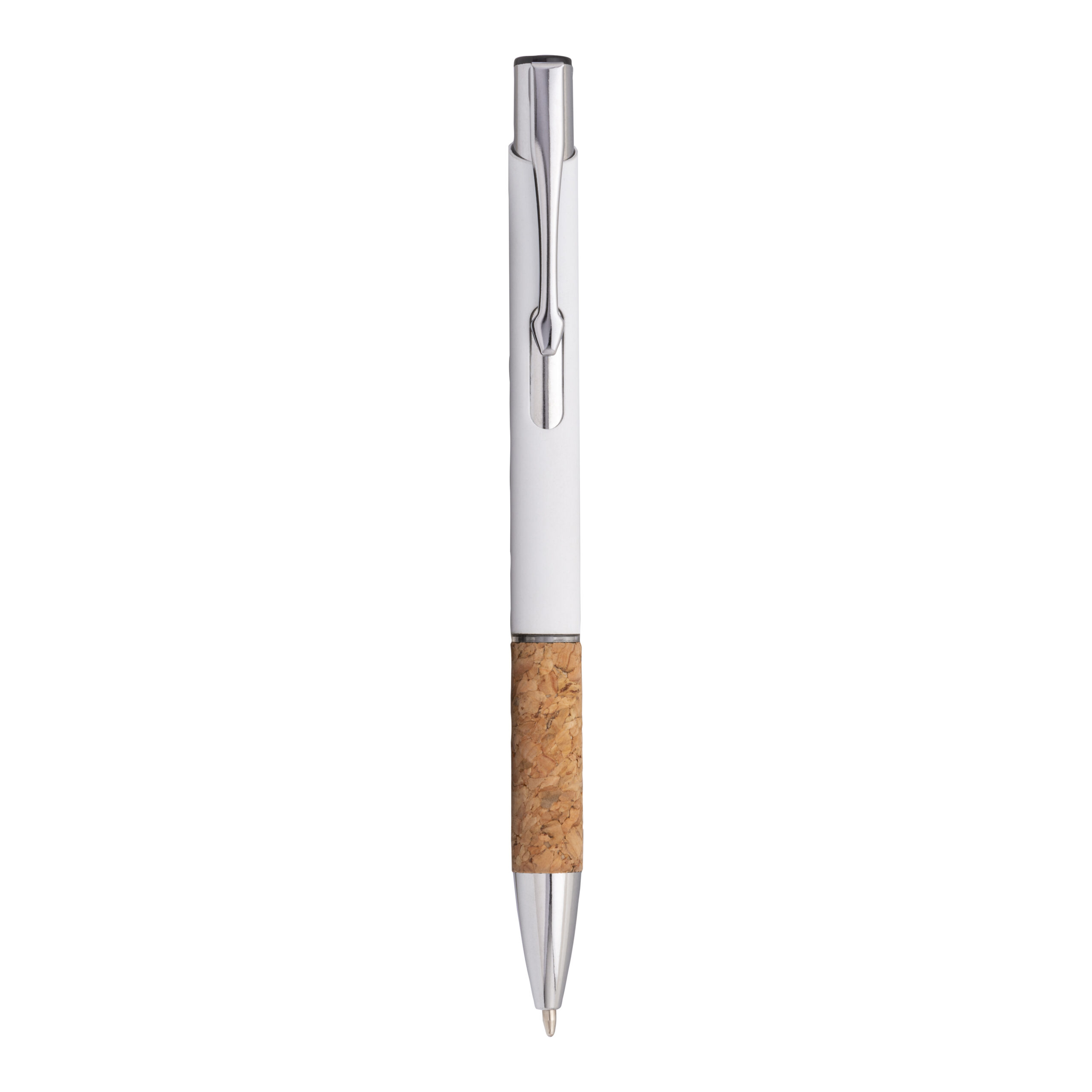 Penna a scatto in alluminio gommato, impugnatura in sughero e particolari cromati, clip in metallo