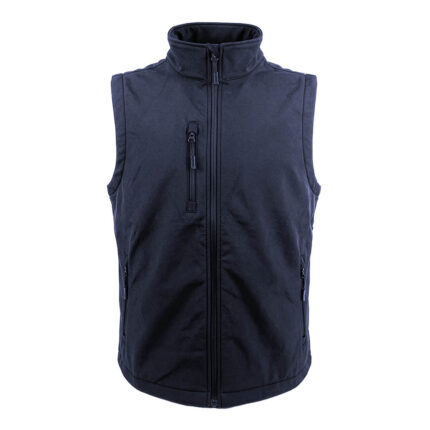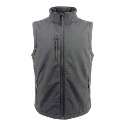 Smanicato softshell unisex in tessuto rigenerato da 280 g/m2 (98% poliestere riciclato e 2% spandex). Una tasca frontale e due tasche laterali con cerniera, struttura con cuciture laterali