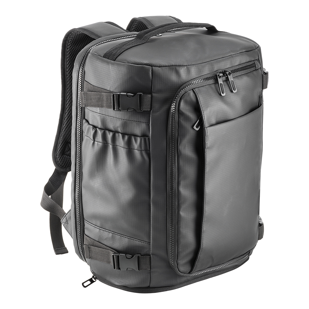 Zaino da viaggio cabin size con porta pc (15) in poliestere 600D con rivestimento in PU water resistant. Compartimento imbottito per notebook. Ampio scomparto principale con ganci per vestiti. Maniglia superiore e maniglia laterale imbottite. Tasca laterale e tasca inferiore con zip. Sistema di aggancio ai trolley